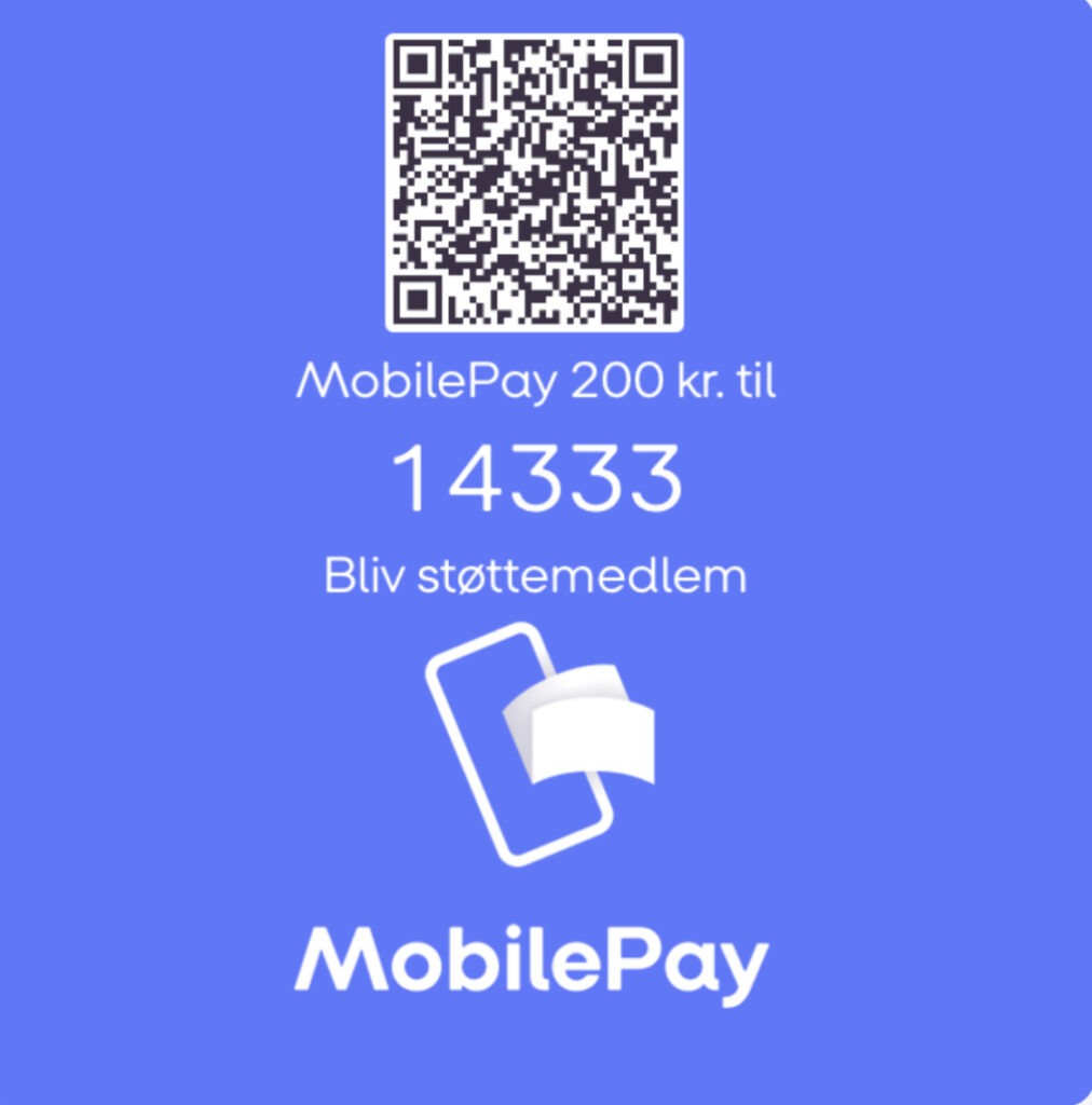 Udfyld formularen, hvis du ønsker et støttemedlemsskab, indbetal beløbet via MobilPay på 14333 eller scan QR-koden med dit kamera eller MobilePay-app for at komme nemt i gang.